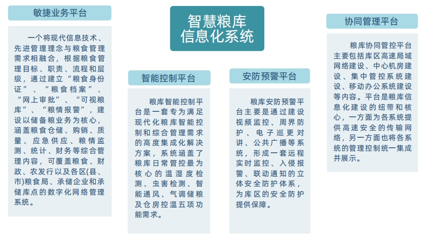 | 智能出入库管理系统 | 智能气调管理系统 | 视频安防管理系统 | 内环流温控管理系统 |
